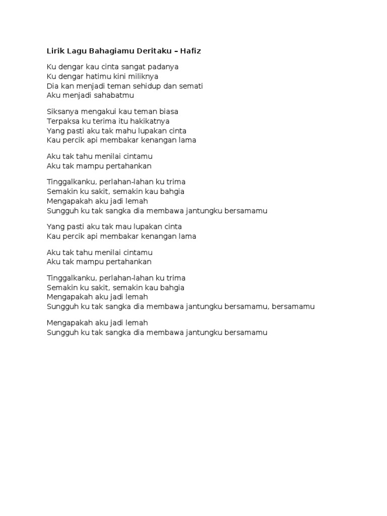. Lirik Lagu Bahagiamu Deritaku Hafiz Ku dengar kau cinta sangat padanya Ku dengar hatimu kini miliknya Dia kan menjadi teman sehidup dan semati Aku menjadi sahabatmu. Lirik Bahagiamu Deritaku Hafiz. Siksanya mengakui kau teman biasa.